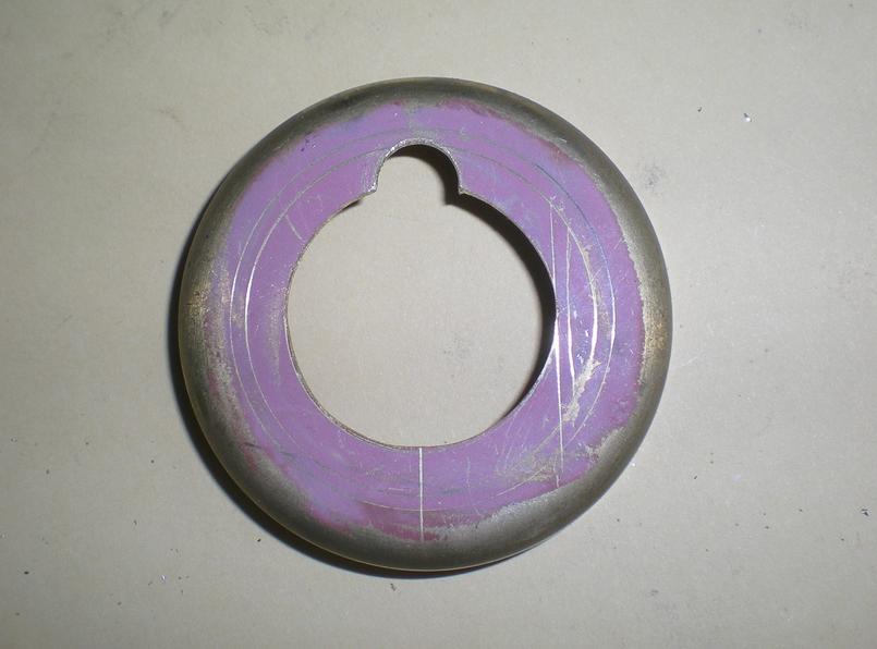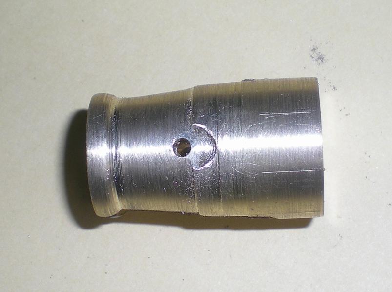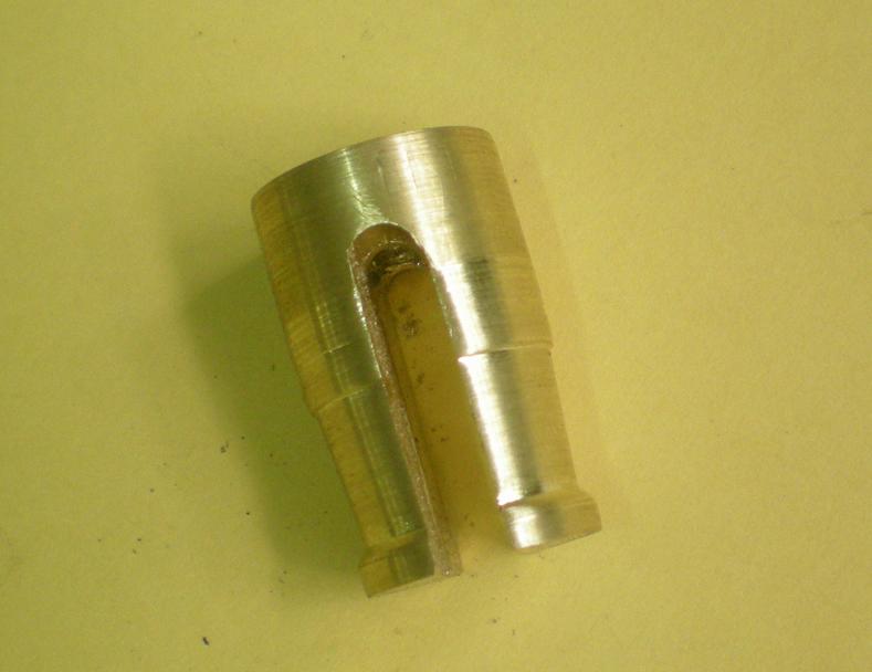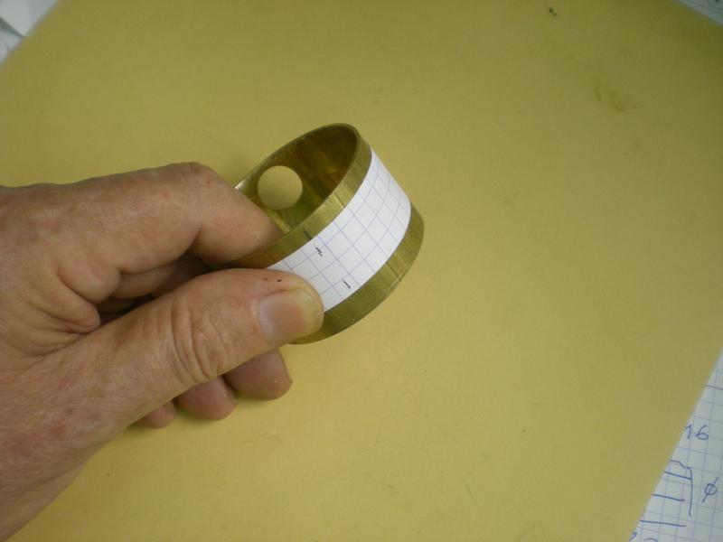Pour se faciliter la tâche, on peut partir d'un "fond bombé" de diamètre extérieur 50, le même modèle que celui utilisé pour la chaudière. On trace et on découpe une ouverture à la scie fine après avoir percé un trou de diamètre 8 qui servira au passage de la barre de blocage. Attention sur le plan se trouve une erreur : le rayon de cette ouverture est bien de 14 mm.