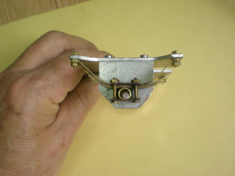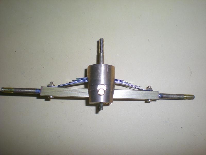 Les lames de ressort sont simplement découpées dans de la tôle de 0.3 d'épaisseur. La prolongation de l'axe du pivot facilitera leur montage (trou central dans les lames) et les empêchera de glisser par la suite. Ce montage fonctionne parfaitement et notre essieu sera capable d'absorber les différences de niveau ... |