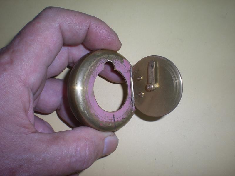 | La porte est une rondelle de laiton de 1 mm d'épaisseur et de diamètre 36. Il faudra en couper un arc pour pouvoir placer la charnière. Pour le perçage des trous (1.8) utiliser la charnière. Pour le montage on utilise des vis M1.6, qui seront mises à longueur après blocage. |