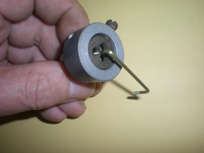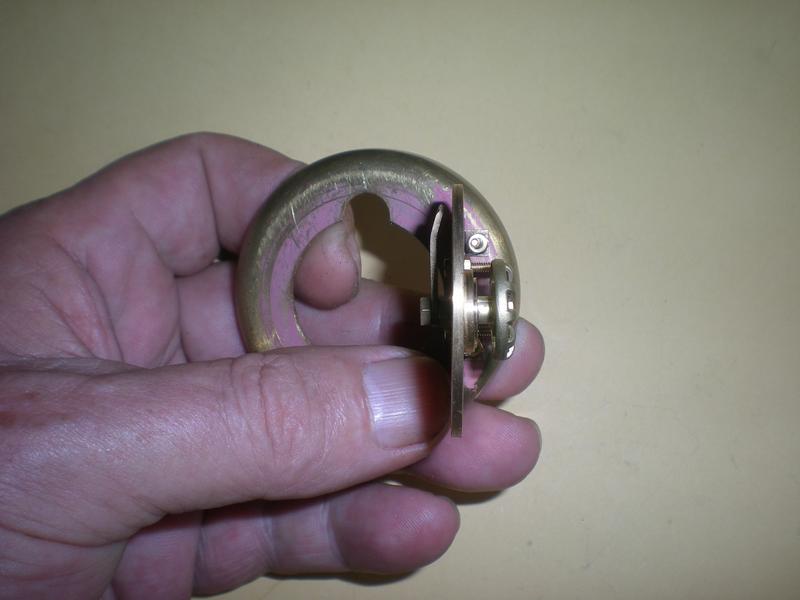 En position d'ouverture : la languette de laiton bloquée sur la tige du volant doit passer dans le trou percé au début. |