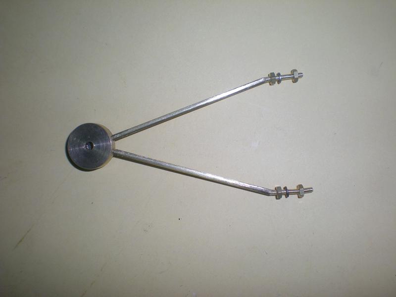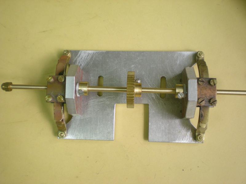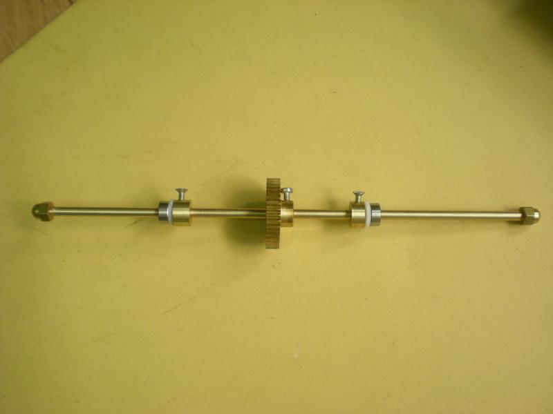 Montage de l'axe. Pour ceux qui comme moi, privilégient le laiton pour l'axe, il faut dépolir sérieusement le rond pour que les roulements glissent facilement sans pour autant perdre de leur efficacité... |