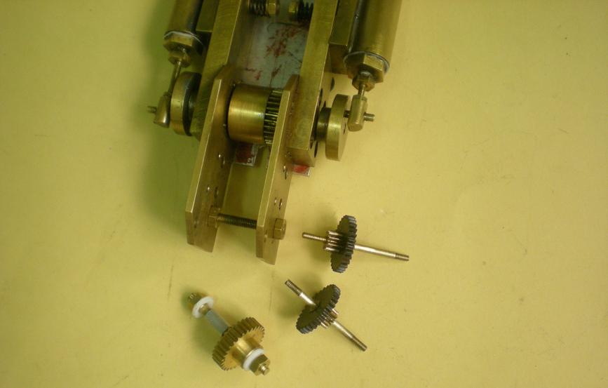 On ajoute donc un nouveau pignon qui va prendre la place de l'axe des roues. Les axes des pignons (simples tiges filetées au départ) sont remplacés par des ronds de laiton de 2 (de l'inox serait mieux) filetés en bout. |