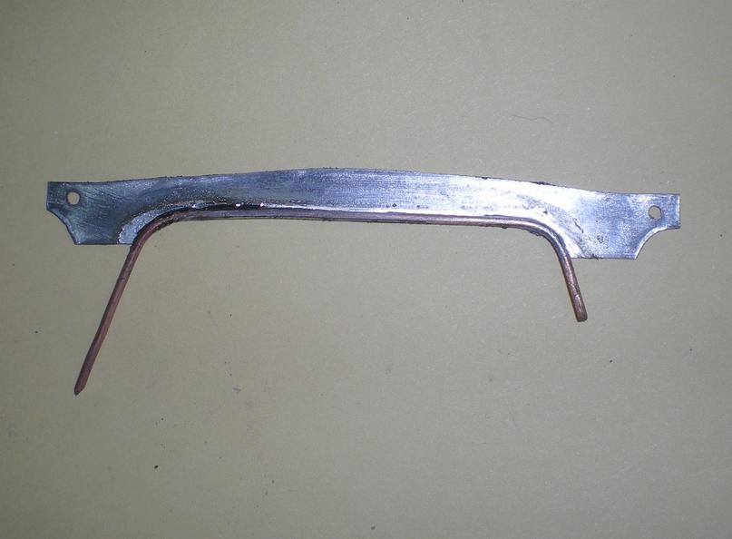 | Fixation : la soudure des ronds de cuivre se fera sur ce montage. Petite découpe supplémentaire pour le passage de la sortie vapeur. |