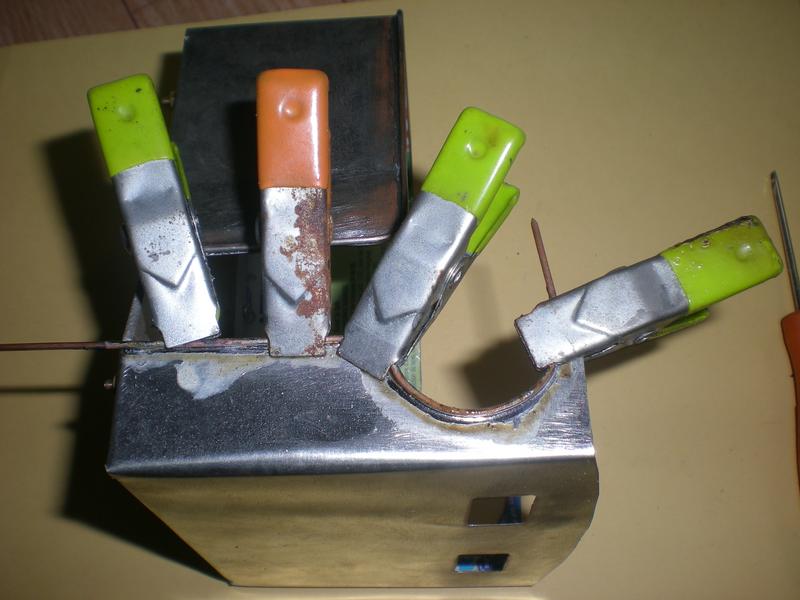 | Première soudure. On l'obtient facilement après un bon décapage et avec un fer très chaud : . enduire la tôle et le fil de cuivre de décapant . positionner avec des pinces . charger le fer avec le fil d'étain, le promener au dessus puis au-dessous . déplacer les pinces, remettre de la pâte décapante et souder ... |