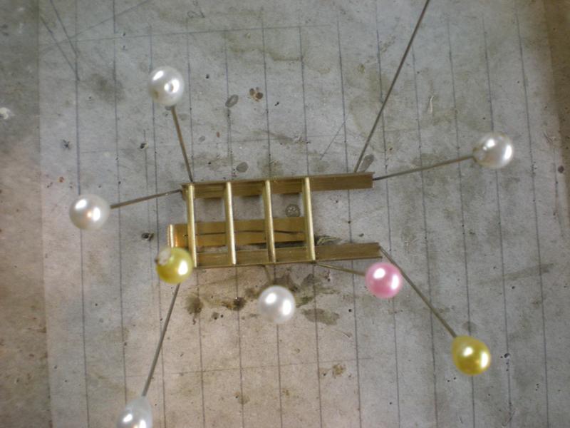 On part de cornière de 4 que l'on perce (10 mm entre les échelons semble correct pour l'échelle). Les cornières sont percées à 2 pour recevoir du rond de 2 que l'on arrondira un peu aux extrémités. Petit montage sur du placoplâtre pour la soudure à l'étain. |