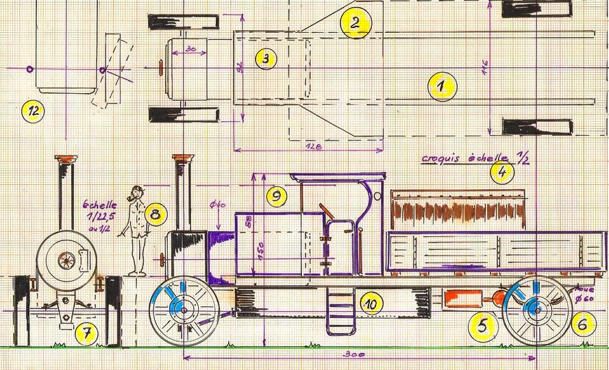| 5 - moteur oscillant bi-cylindre double effet 6 - roues à l'ancienne 7 - essieu avant 8 - boîte à fumée |
