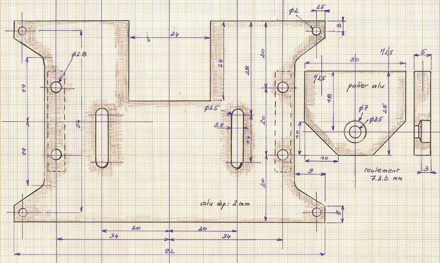 montage du moteur | On utilise pour cela les trous déjà percés à M3 . Petite plaque d'alu de 2 d'épaisseur et de 30 x 60 qui viendra se fixer sur 2 traverses.