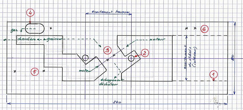 1 - les découpes doivent se faire à l'intérieur des longerons du châssis 2 - les points de repère : perçage au dessus des écrous de fixation du moteur 3 - emplacement de l'inverseur 4 - découpe pour le passage de l'écrou de raccordement au réservoir de gaz 5 - trous pour la fixation du réservoir 6 - trous pour la fixation du servo commandant l'inverseur |