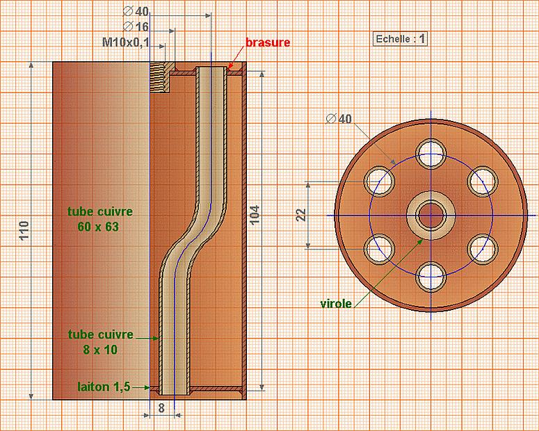 | |  | La brasure gardant toujours ses secrets pour moi - je me voyais mal allant souder dans un fond - , deux couronnes sont ajoutées à la base et au sommet : celle du bas recevra le brûleur, et celle du haut le chapeau. Pour les obtenir, on utilise le même tube que celui de la chaudière, sciage transversal, petit écartement pour que ça s'emboîte et pièce rapportée et soudée ... |