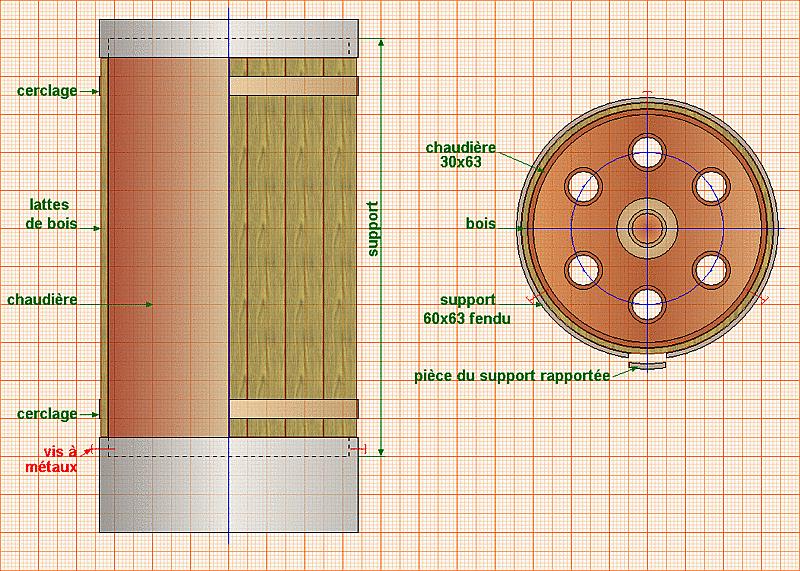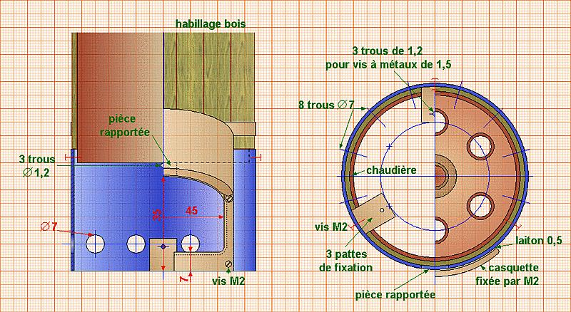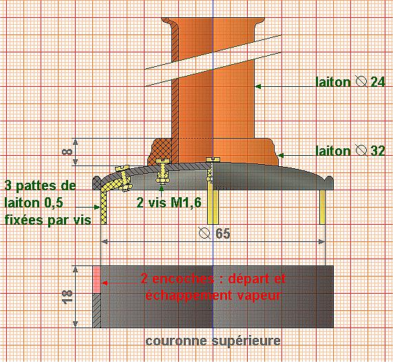 2 encoches permettront le passage de deux tuyaux: . sortie de vapeur vers le moteur . échappement dans la cheminée |