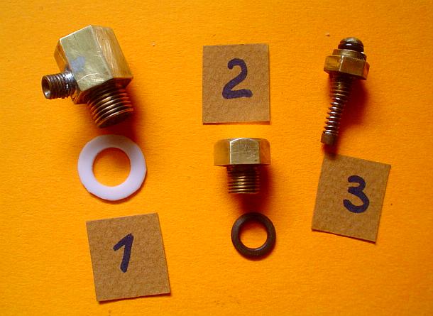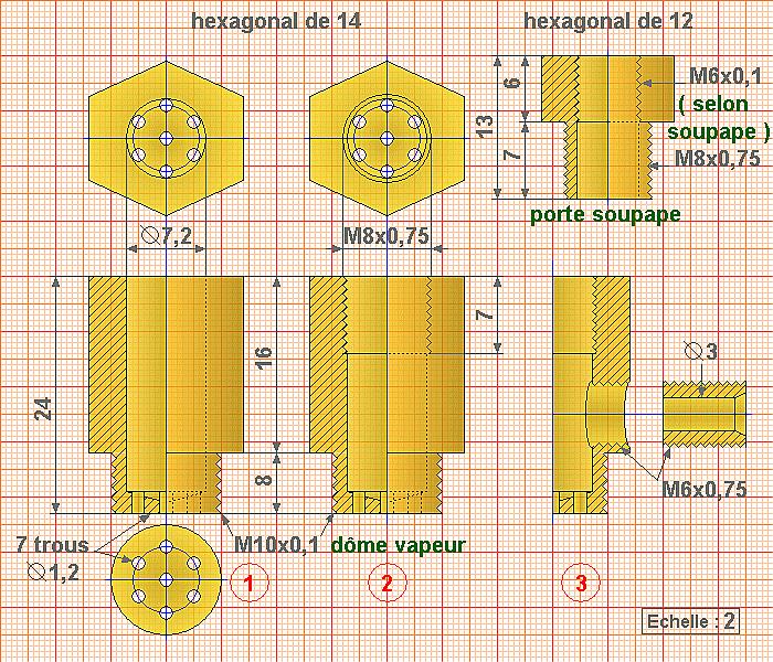 |  1 : le dôme avec le raccord pour le départ de la vapeur et son joint en téflon . N'ayant pas d'emporte-pièces de 10, je me suis souvenu d'un petit truc pour le percer : voir ci-contre. 2 : raccord entre dôme et soupape. 3 : la soupape la plus simple et la moins chère . |