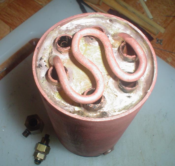 vue de dessous Une idée du Forum de MRB : ajouter un serpentin pour améliorer la chauffe ! Et si ce n'est pas parfait, le fonctionnement semble meilleur. |