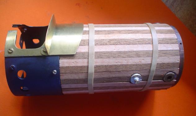 Les lattes de 0.5 d'épaisseur sont de 2 tons. Mise à longueur et ajustage autour des viroles avec un maintien provisoire par élastique. Repérage sur la couronne inférieure fixée. De légers ajustements au cutter seront nécessaires pour l'alignement supérieur après collage.