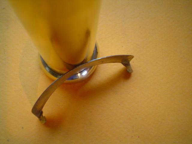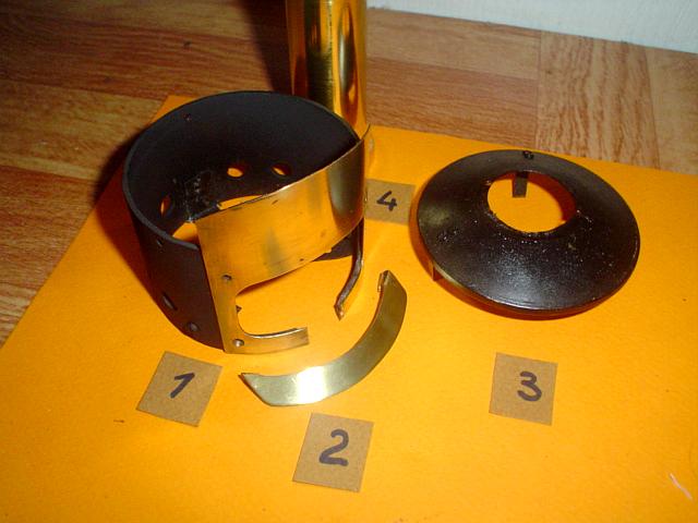 couronne supérieure,chapeau, cheminée Le chapeau s'emboîte dans la couronne supérieure à l'aide de 3 pattes en laiton. Il est issu d'un fond de bombe à peinture ...donc bombé !
