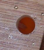 Points de colle (araldite) sur les lattes sans découpe mais collage complet pour les lattes en petits morceaux. Un cerclage laiton est prévu.