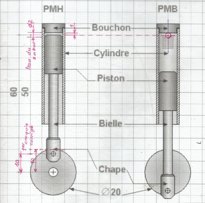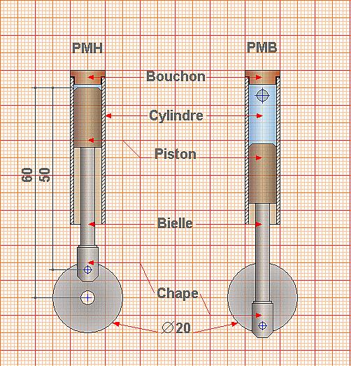 Dessiner le piston en position haute (PMH = point mort haut) et en position basse (PMB = point mort bas) accompagné de sa tige et de la chape. Entre le PMH et le PMB, on aura notre déplacement de 20 mm. On déterminera ainsi la distance maximum entre le trou du sabot et l'axe moteur : ici, 60 mm. A noter qu'au PMH, le piston devra s'arrêter à 1 mm du bouchon soit, avec un trou dans le sabot de 2 mm, en son milieu. En chanfreinant un des bords du piston, on obtiendra une admission totale de la vapeur.