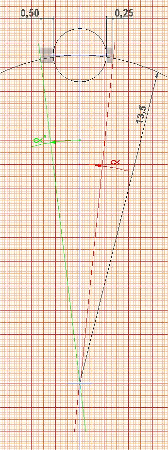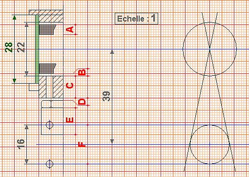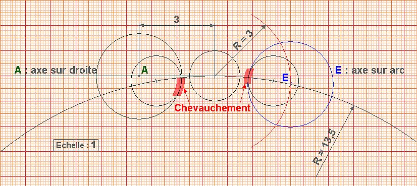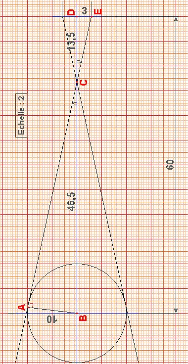 Le diagramme a été établi par le tracé perpendiculaire de (A) et (E) alors que les trous seront sur un arc de cercle de rayon 13.5. Par le tracé, on voit que l'incidence est insignifiante.