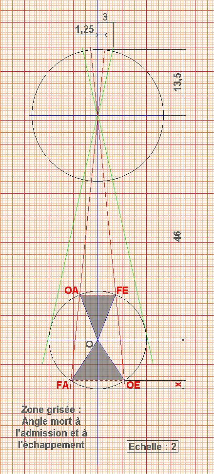 Si on ne considère que le croquis, il semblerait que : Admission total soit d'un peu plus de 40° l'angle mort à l'Echappement totalsoit d'un peu plus de 65° et que x** , la remontée du piston pour atteindre la bord du trou d'Echappement (Pfff …), soit de l'ordre de 1.5 mm, plutôt correct ! quant à la distance entre OA et FA, elle est insignifiante.Les croquis redessinés par Eric ont mis fin à ces approximations : OA/O/FE = 43°14 ; FA/0/OE = 67°16