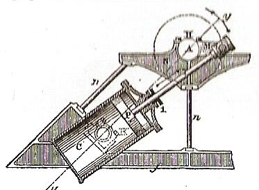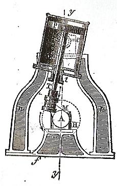 la tige du piston fait, lors de sa position moyenne d'oscillation, un angle de 45°, mais elle sort par le dessous du cylindre.