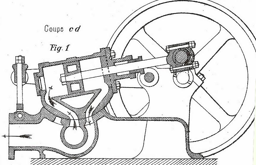 Un croquis qui me plaît beaucoup et qui montre tout le savoir-faire de nos anciens : le cylindre, en oscillant sur une "glace" courbe, assure sa distribution ! Une réalisation technique surprenante. |