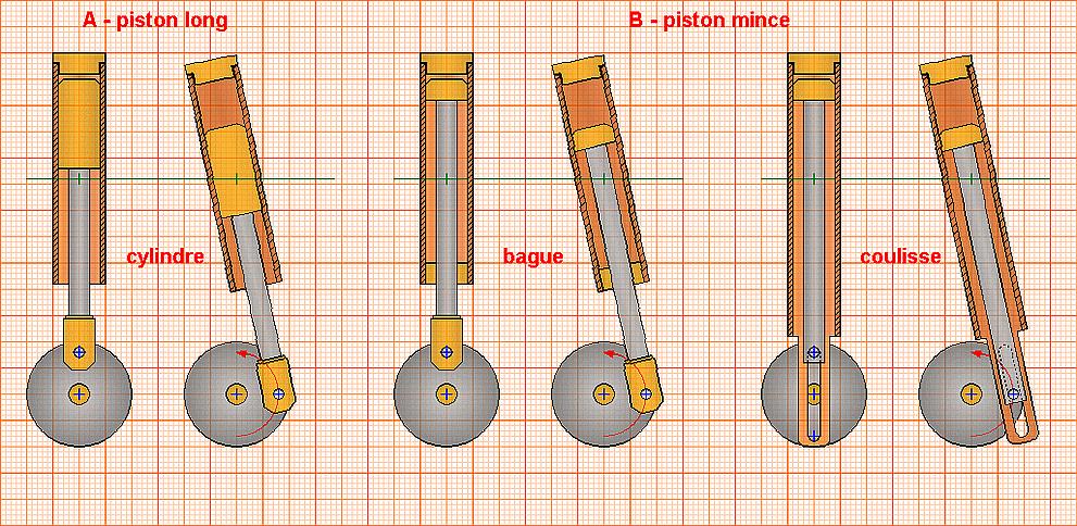 En B, des pistons courts que l'on peut réduire à une simple rondelle ou, plus élaboré, à des coupelles de téflon. Si on ne fait rien, le piston va se promener comme bon lui semble car il ne sera pas guidé dans le cylindre. Pour obtenir le guidage, deux solutions : ajouter en bas du cylindre une bague amovible qui va guider la tige du piston et le maintenir parallèle au cylindre, ou utiliser le système de Monsieur Monsieur MASSERAN qui prolonge le cylindre par une coulisse.