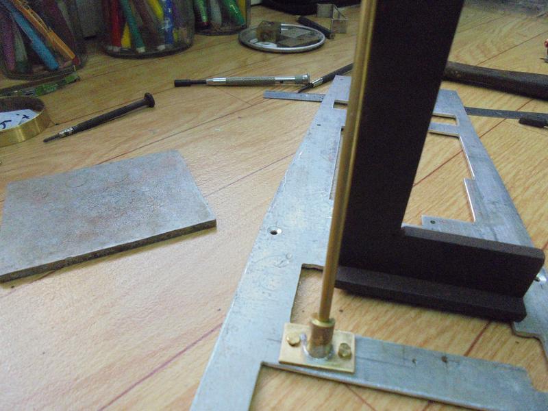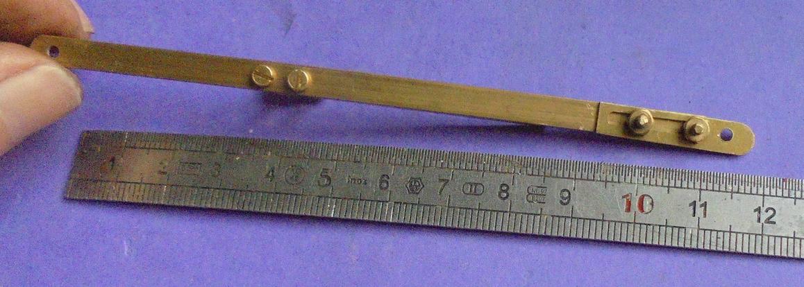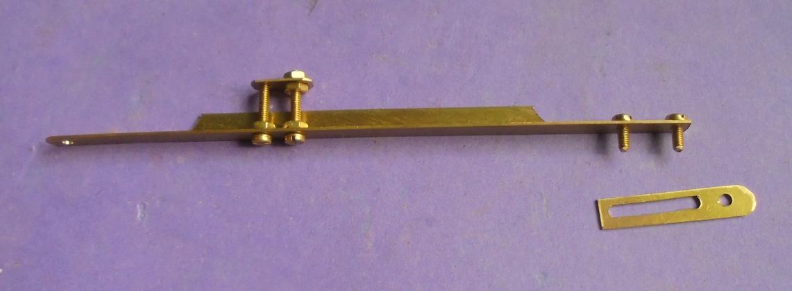 | Le levier de commande de l'inverseur est rigidifié : une fois la forme de la languette de laiton en 0.5 bien définie, on dessine sur un plat de 1.5 une "équerre" que l'on soudera à l'étain. Et le mouvement de l'inverseur s'en trouve amélioré. |