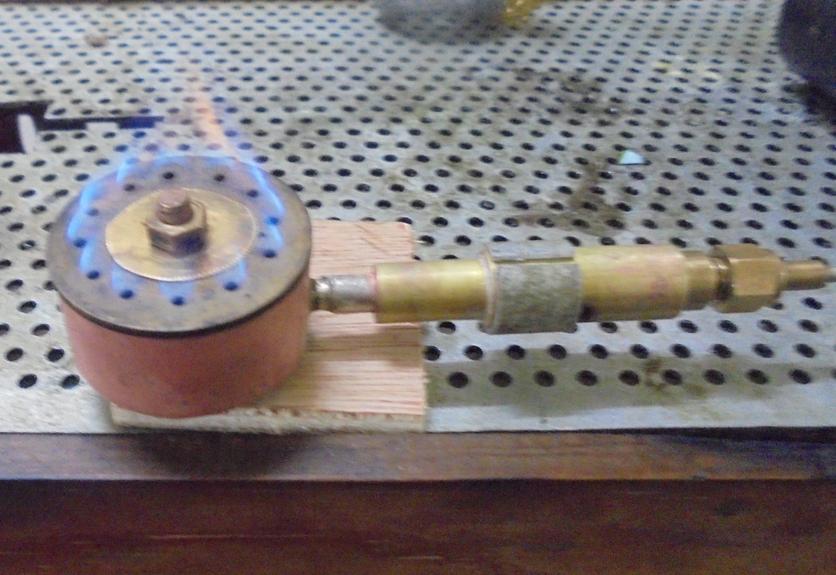 | Trois modifications au brûleur : . on avance au maximum l'arrivée de gaz par le porte-gicleur . on obstrue les trous du milieu (rondelle de laiton de 0.5 d'épaisseur) . on place de la laine d'acier dans le corps du brûleur. Une flamme plus chauffante qui va demander une ouverture minumun de la vanne de gaz. |