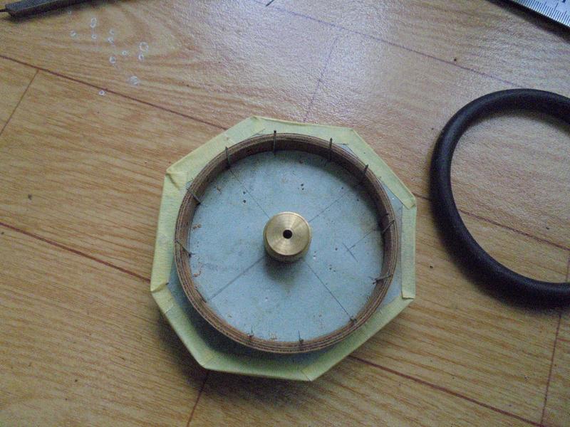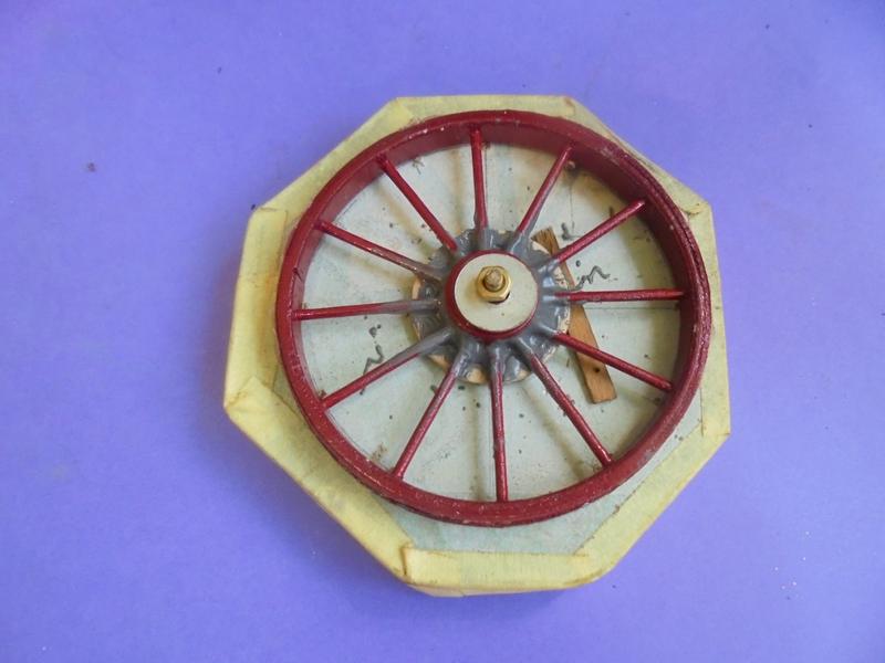 | Un morceau de placoplâtre percé au centre d'un trou de 8. Bien repérer les distances pour que la roue tourne rond ...