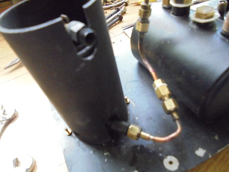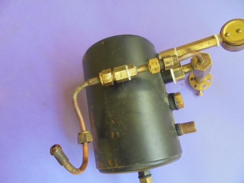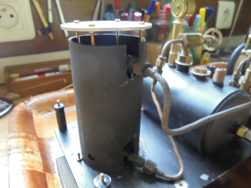 Réalisation d'un réservoir de vapeur qui se placera à la sortie du serpentin : longueur de 70 dans un tube de laiton de 10/12. Il servira à réguler le débit de vapeur. Une chose finalement inutile que la virole permettant de placer un manomètre qui ne nous donnera su'une pression dynamique. |