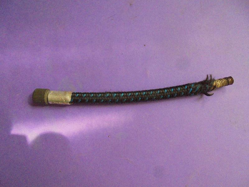 Nouvel embout de gonflage réalisé à partir d'un raccord pour pompe à vélo. On coupe l'extrémité et on y installe un raccord M6 x 0,75 que l'on pourra brancher sur le compresseur. Compresseur réglé à 5 bars, ouvrir, le mano du réservoir pressurisé monte à 5 bars, ne pas fermer l'arrivée d'air, desserrer l'embout en le tirant vers soi, la pression baisse à peine dans le réservoir. |