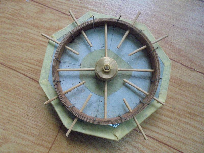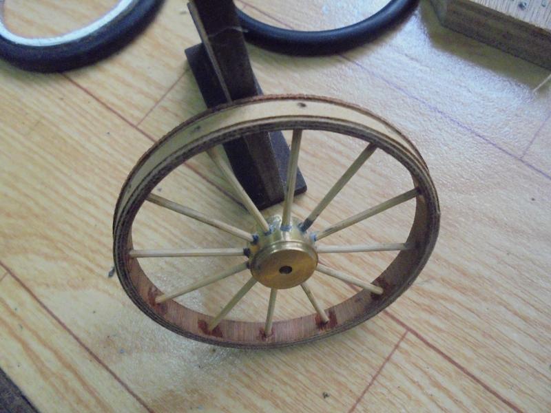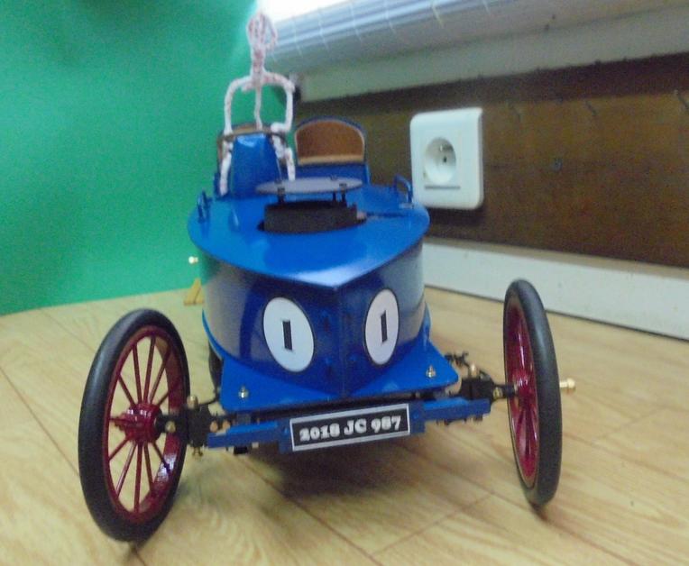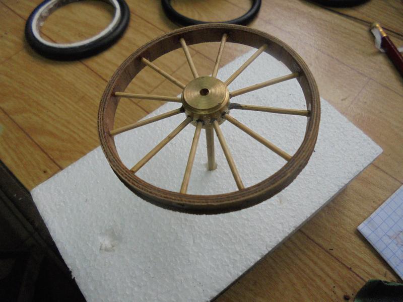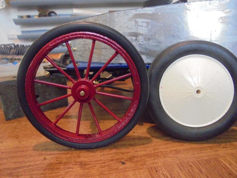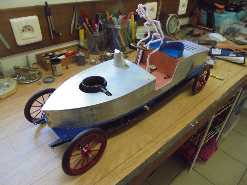 les roues et la carrosserie | On peut essayer de faire quelque chose qui ressemble à la voiture de Léon SERPOLLET pour obtenir un modèle qui doit être de environ 1/8ème. Mes roues ne font que 80 mm de diamètre. Il en existe de 89 et ce serait,je pense, meilleur pour l'aspect général.