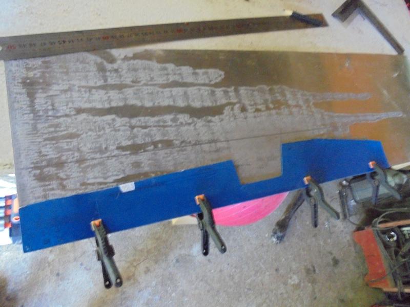 une carrosserie en alu de 1.5 d'épaisseur | c'est ce que j'ai trouvé de plus fin ... Remarque : cet alu fin que j'ai récupéré présente des traces de colle (probablement une feuille protectrice) qu'il va falloir éliminer avant peinture. On passera à l'acétone, on grattera et on poncera sinon la peinture sera à refaire !