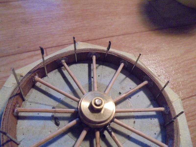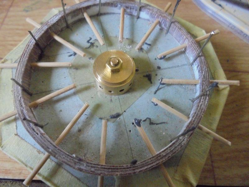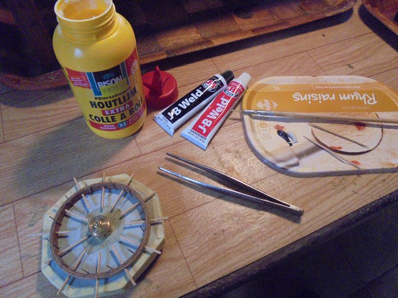Certes, cette fois elle est bien inutilisable mais on peut la réparer et en profiter pour lui redonner le bon alignement des rayons sur l'axe. On utilisera de la résine qu'on collera d'abord sur un disque de contreplaqué à l'arrière puis, après durcissement, on on placera avec un cure-dents la même résine entre les rayons. On en profitera pour régler le problème de l'alignement avec une ou des cales. |