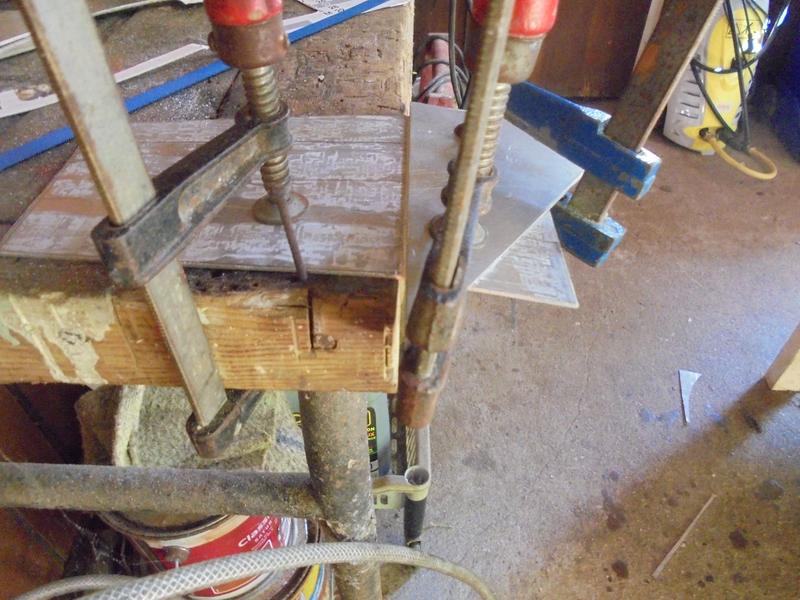 Une méthode pour plier le capot arrière : à la scie à métaux (lame seulement) effectuer une rainure sur la moitié de l'épaisseur qui va favoriser un pliage net et non courbe. La lame est guidé par un plat maintenu par un serre-joint. |
