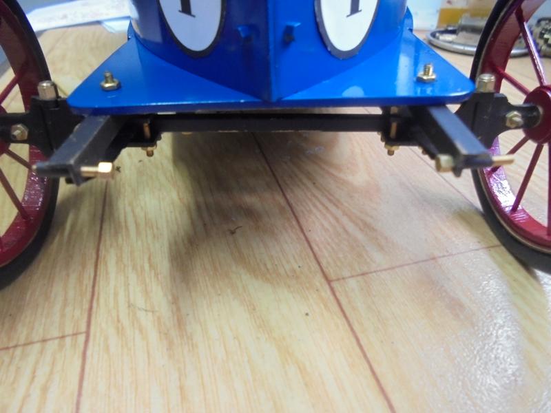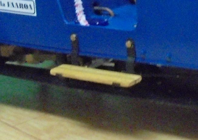 | Suite aux incidents lors du premier essai dans cette nouvelle version, pose d'un pare-chocs : plats de laiton de 1 x 5 et rail de laiton. Dans l'espace des essais truffé d'embûches, il va bien souffrir mais protéger les roues avant. |