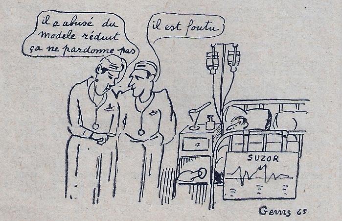 Beaucoup d'humour dans ses textes mais aussi dans ses dessins car il avait le crayon facile. Et il ne s'épargnait pas comme en témoigne ce croquis de 1965 alors qu'il vient de subir sa troisième attaque cardiaque ... |