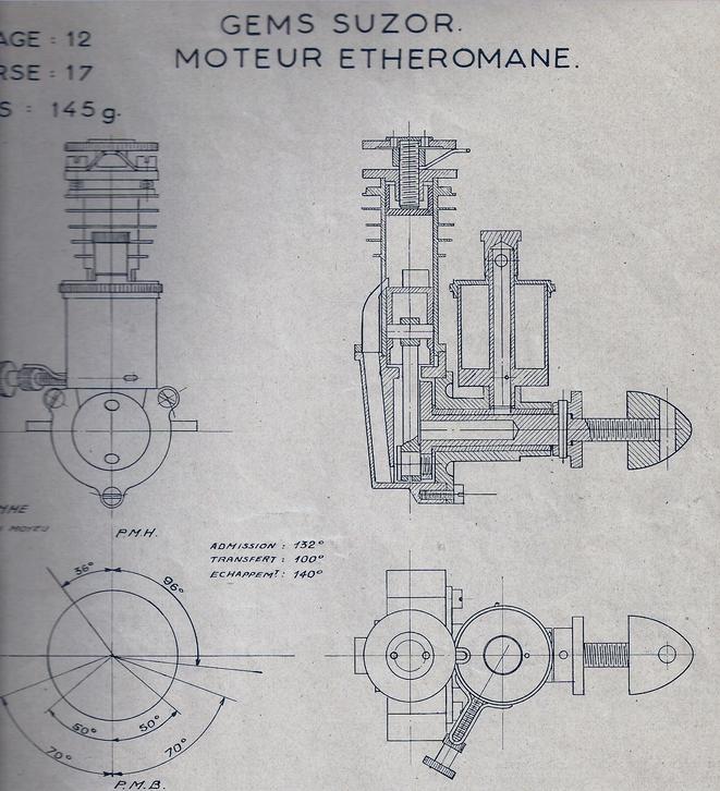 Les Mons nous a dit qu'il a été incité à construire l'Etheromane en voyant une photo sur la page de couverture du magazine Strictly IC. Par un curieux hasard Ken Croft nous fournissait au même moment une interprétation de ce moteur. On y voit mieux le tube de transfert quelque peu inusité imaginé par Gems Suzor. Gems Suzor a dû chercher à minimiser le volume de pré-compression dans le bas moteur. ET Westbury lui aussi grand concepteur de moteurs de modèles réduits par contre n'était pas un grand fan des bas moteur au volume très réduit pour les 2T, prétextant qu'un travail de pré-compression excessif c'était de l'énergie gaspillée en pure perte lors de lacourse de descente du piston.