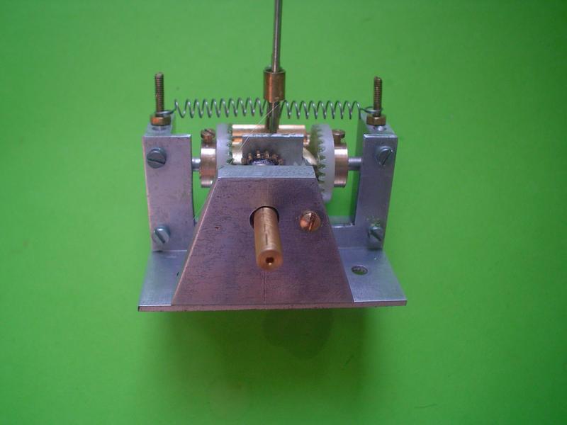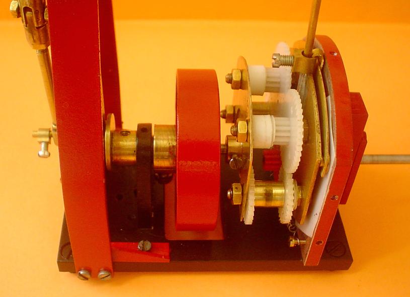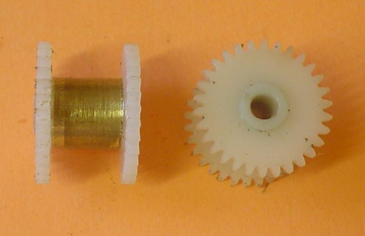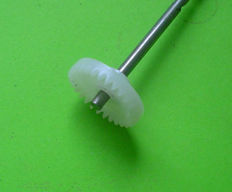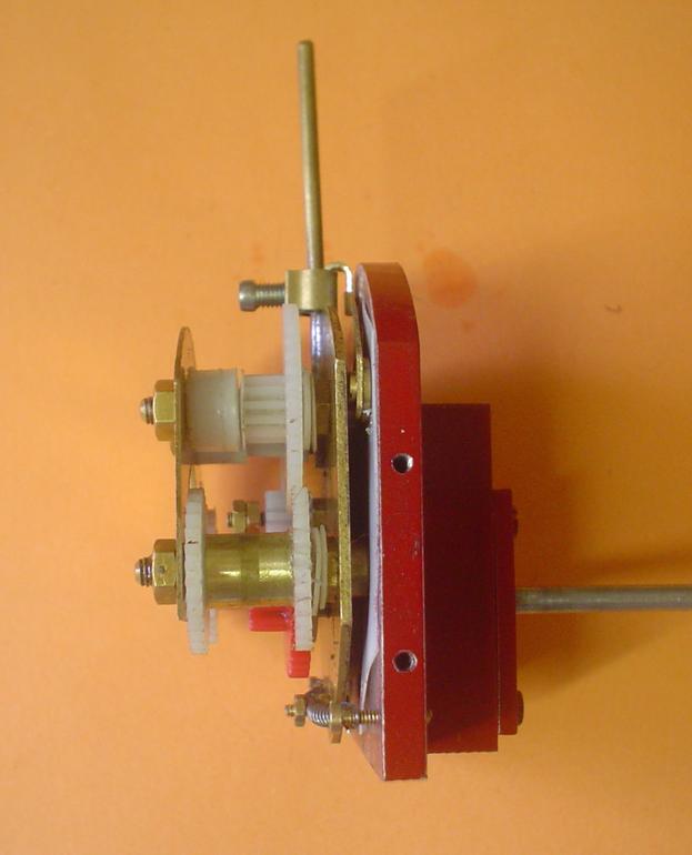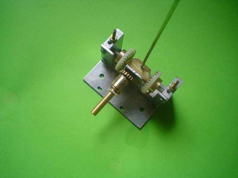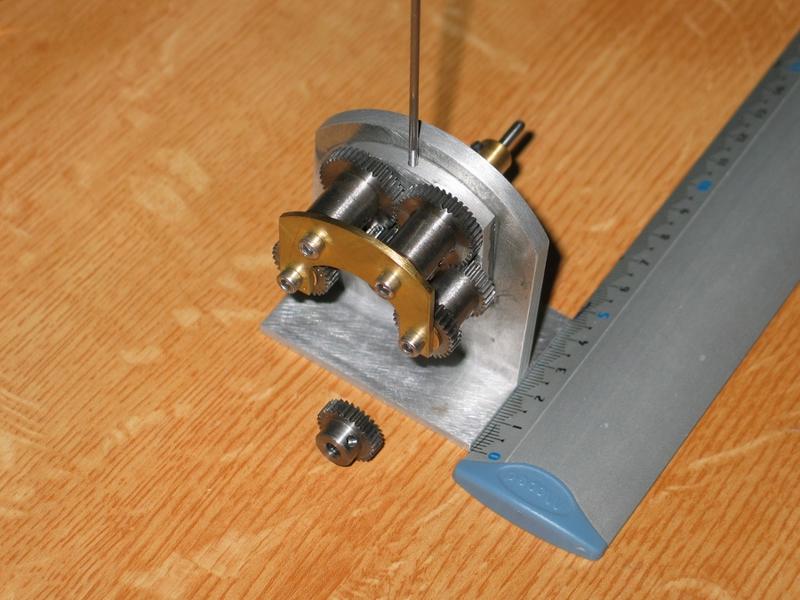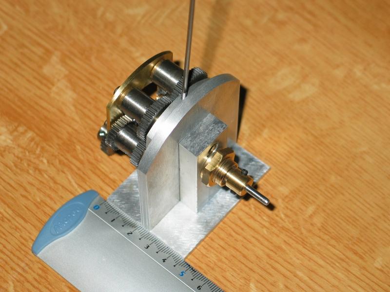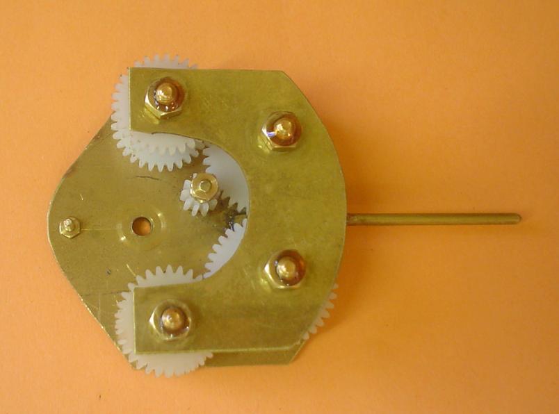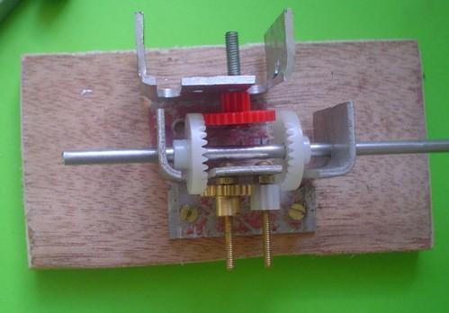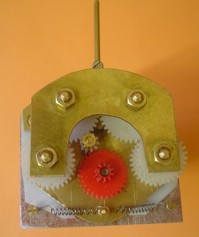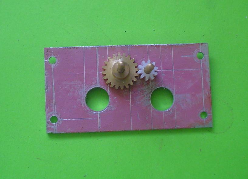 Le montage est obtenu à partir de roues dentées droites en plastique (une de 6mm en diamètre de tête, deux de 16 et deux de 21 : 0,5 de module). Pour un montage plus sérieux, des roues en laiton seraient bien mieux. |