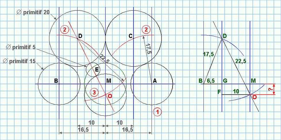 Détermination de la position de O par le traçage en fonction des données connues : la distance entre les axes des roues engrenées est égale à diamètre primitif de 1 + diamètre primitif de 2 2 1 - tracer les axes : 33 entre A et B (voir croquis 1), 20 entre C et D 2 – tracer les centres de C et D à 17,5 de A et B 3 – tracer le centre de O à 22,5 de D. Entre D et O, un petit pignon E qui transmet de D à O le mouvement de A et B.