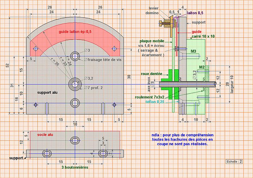 |  | Pour faciliter le glissement, on peut mettre du téflon de 0,25 ou autre épaisseur (tête de vis servant d'axe à travailler en conséquence).