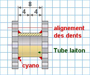 Le montage essentiel : . la roue de 20 dents et la toue de 10 dents doivent s'engrener sans serrer : écartement de 7.5 Pour ces roues D (diamètre de tête : 11 et 6) et, l'une dans l'autre, on doit obtenir 16 au pied à coulisse.