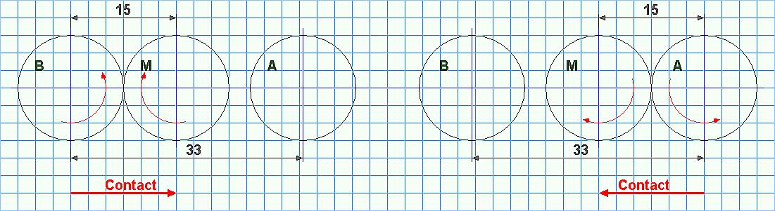 En faisant pivoter A et B, le contact parfait s'établit avec M au moment où la distance entre les axes des roues dentées est de 15 (diamètre primitif). |