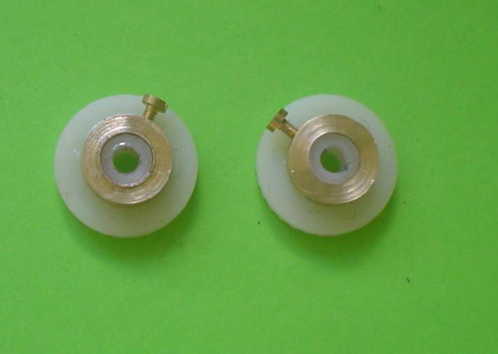 Ces roues sont prévues pour un serrage automatique sur la tige mais ... à l'usage, ça finit pas ne plus tenir. Alors, petite bague en laiton (largeur 3 mm) avec filetage pour une vis d'arrêt qui traverse la bague et le "plastique". La bague, avant perçage à 1.2 pour un filetage à 1.6 est collée à la cyano. |