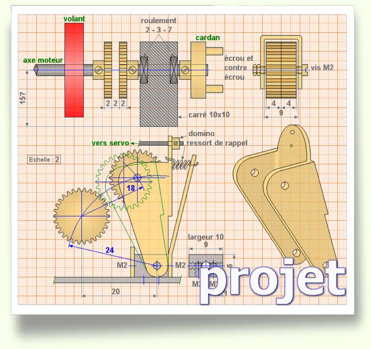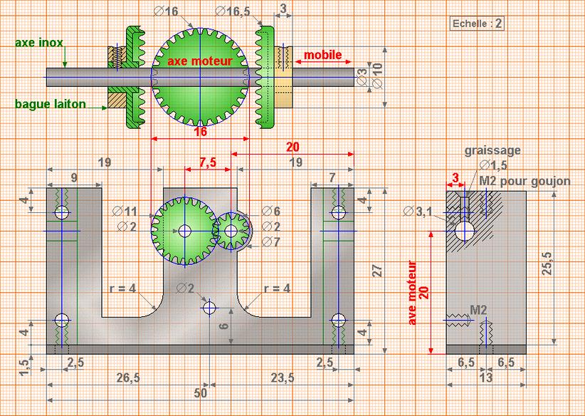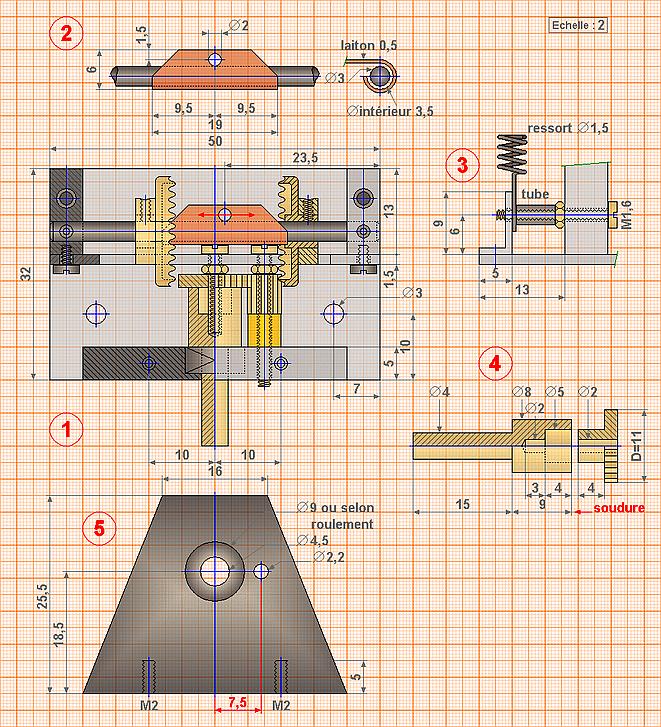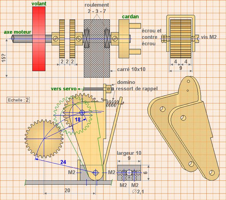 Il est composé de roues à dentures droites de module 0.5 et de diamètre nominal 15. Si on veut plus petit encore, on peut prendre des roues de diamètre nominal 10 ...
