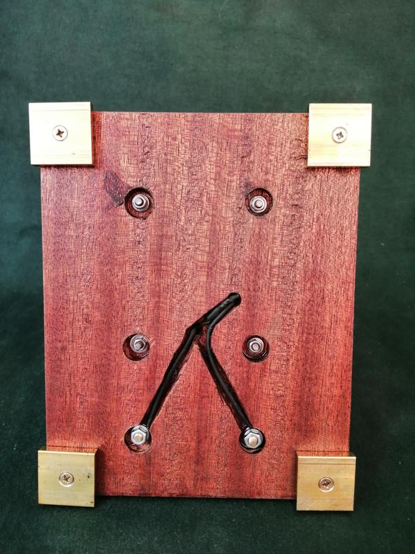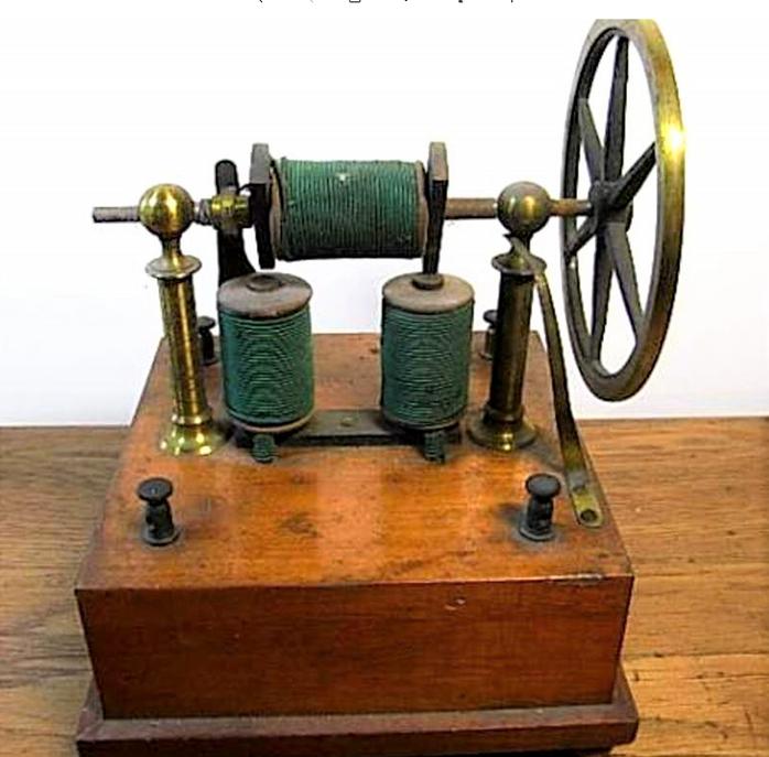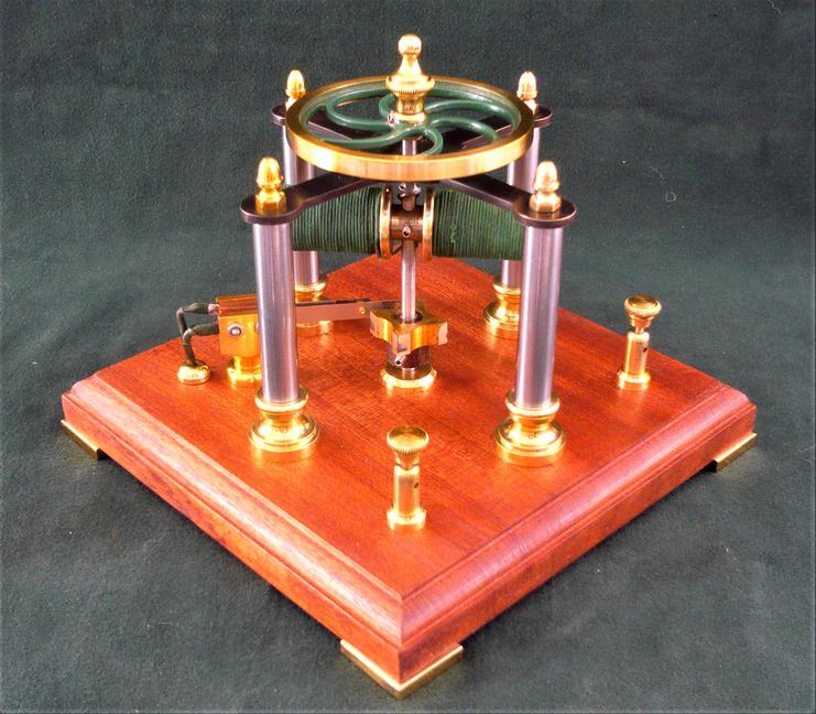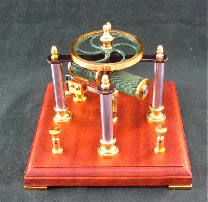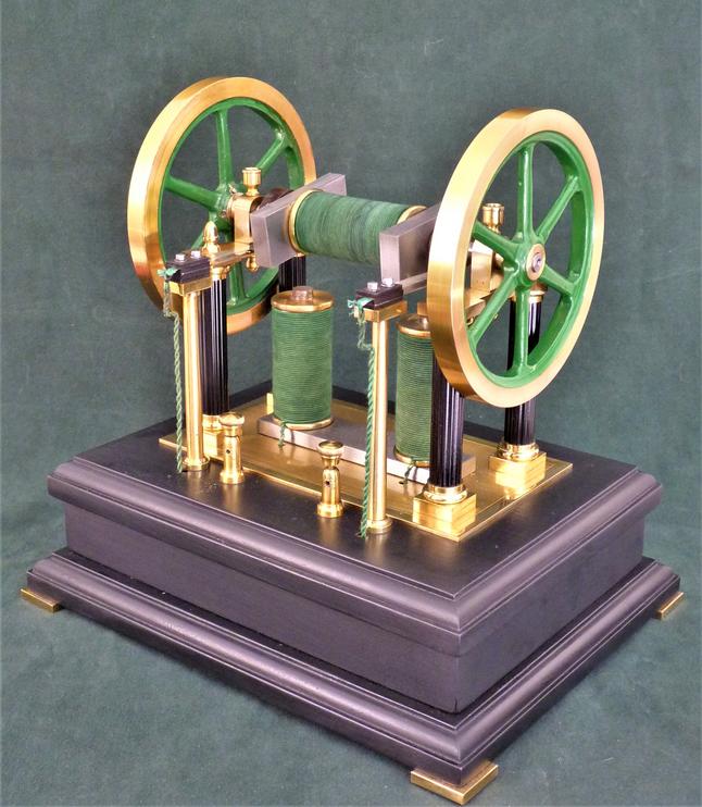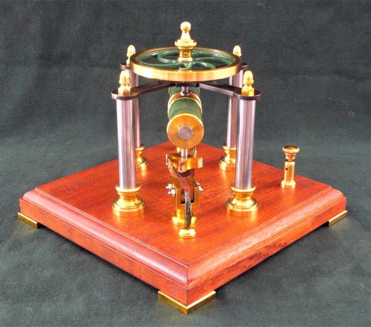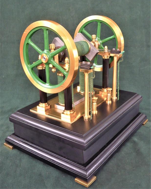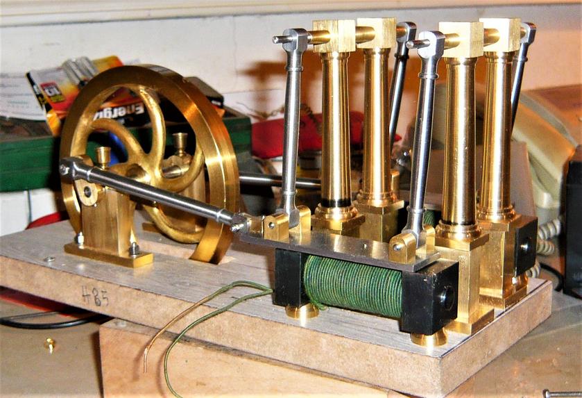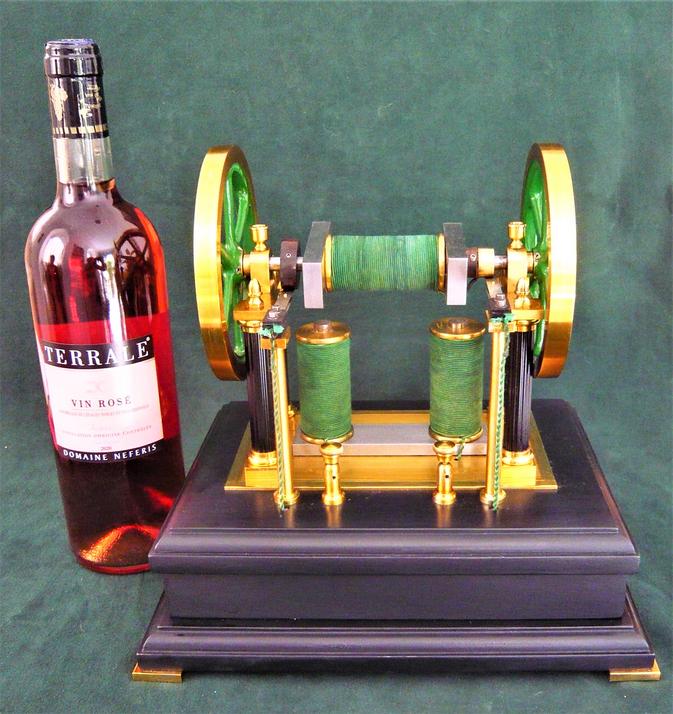 un nouveau moteur bien particulier ..."Je viens de terminé un nouveau moteur qui m'a été inspiré par celui de la e photo ci-contre ! Dans cette configuration, les bobines sont reliées ensemble! l'entrée des fils des deux bobines sont fixées à l'axe vertical qui repose sur un axe en laiton réuni à une des deux bornes, et la sortie du fil guipé de chaque bobine est fixé sur un support à 4 contacts monté, sur un isolant, lui-même fixé sur l'arbre vertical, un contacteur relié à la 2ème borne apporte un courant de 6,5V qui alimente les bobines qui sont ainsi attirées par les 4 colonnes d'acier doux les unes après les autres !... J'ai ajouté un petit volant d'inertie de 80mm de diamètre. Le tout repose sur une base d'acajou ( hélas pas de Cuba !) de 18X18 cm : la hauteur totale est de 17 cm !... P.S. Chaque bobine contient environ 12m de fil guipé de coton blanc de 8/10ème, teinté avec un marqueur vert ! Je réponds à toutes les éventuelles questions !" |