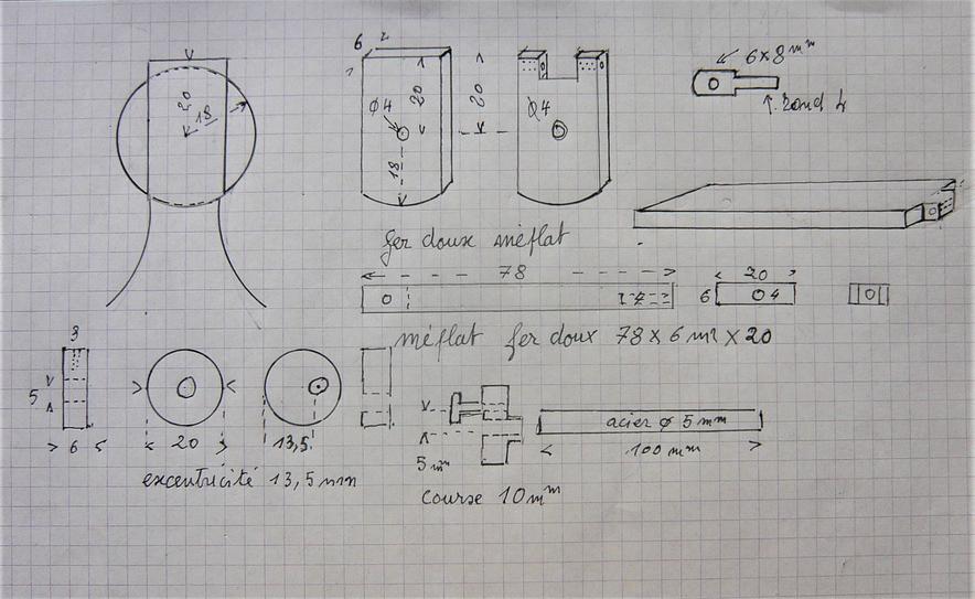 moteur RECORDON 2 | | "J'avais mis sur "face-book" le premier moteur "Recordon" que tu as mis si gentiment sur ton site...Comme on m'a demandé si j'avais des plans et qu'un visiteur avait trouvé un dessin plus récent, j'ai décidé d'en refaire un deuxième un peu plus grand et avec des dessins et quelques cotes ( hélas je ne sais pas trop bien dessiner ) mais je te l'envoie tout de même au cas où cela intéresserait quelqu'un! ? Le contacteur est dans flipper passion, réf : Slingshot Gottlieb 22225. que je transforme pour avoir les deux fils du même côté. J'ajoute quelques idées de montage pour percer du 3mm dans du méplat de 6mm. Percer l'excentrique du contacteur etc... |