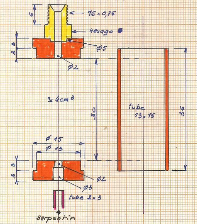 Or ce n'est pas le cas pour ce montage : . le volume du serpentin de 300 cm de long avec un tube de cuivre de 0.2 de diamètre intérieur a un volume de 9.42 cm3 . le moteur a une cylindrée de 1.35 cm3 . le rapport est donc de 9.42 / 1.35 = 7