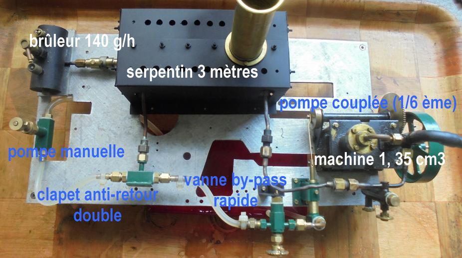 Le moteur : Si on prend ce moteur de 1,35 cm3 à 2800 trs/mn, il consomme 3,780 l de vapeur à X bars (x = poids spécifique de la vapeur en g/l à une pression absolue donnée). La pompe lui fournit 0,02 x (2800/6) = 9.3 cm3 ou 9.3 g d'eau On peut alors écrire que 3,780 x X bars = 9.3 g et X = 2.46 g/l, plus important que 2.12 (4 bars absolus) et plus faible que 2.61 ( 5 bars absolus). Disons qu'il tourne entre 4 et 5 bars absolus …