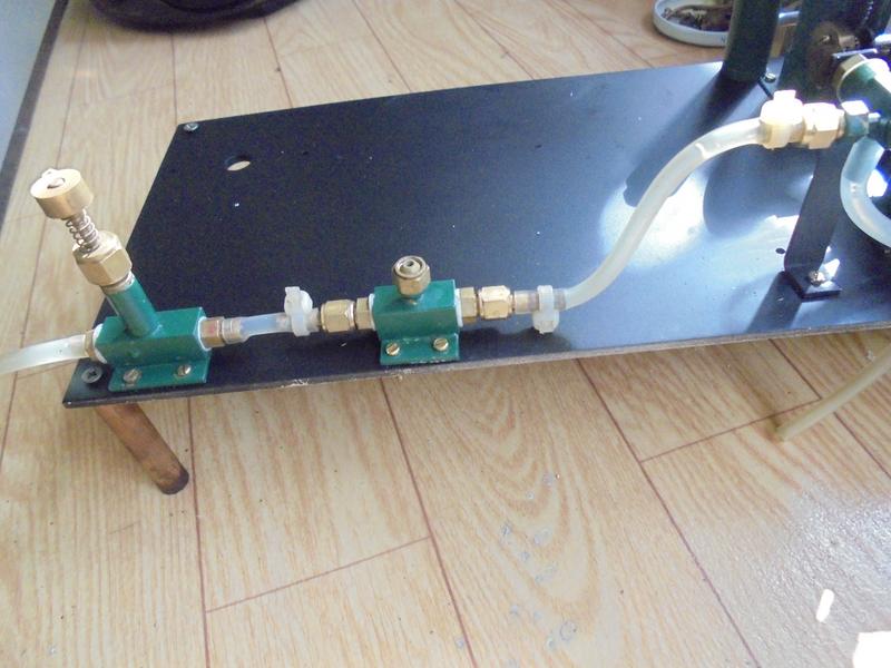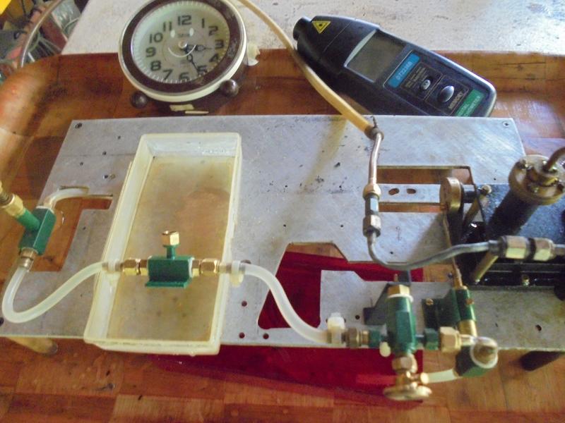 Le mieux est encore de réaliser le montage ci-contre et de faire tourner le moteur à l'air comprimé. La vanne by-pass est restée dans sa dernière position, aux ¾ environ de l'ouverture totale. Résultat de cette mesure : A 1050 tours, le débit en une minute est 23 ml soit de 0.022 ml par tour., pas très loin finalement de l'estimation. Cependant il manque encore le raccordement au serpentin où il est possible qu'une contre pression s'exerce par le biais du dernier clapet anti retour. On va donc estimer le dernier débit à 90% = 0.0198 soit 0.02 ml.
