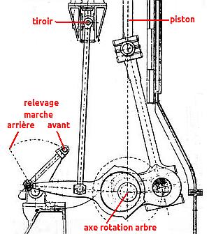 la version simple : essais | Par version simple il faut entendre sans recherche de renversement de vapeur. L'utilisation détournée de la bielle d'excentrique réduit non seulement la place qu'elle occupe mais facilite les réglages : le levier qui commande la position du balancier permet de compenser les erreurs du calage du tiroir en le montant ou le descendant. On obtient ainsi le rendement maximum et le ralenti qui n'est pas évident avec des tiroirs sans recouvrement. |